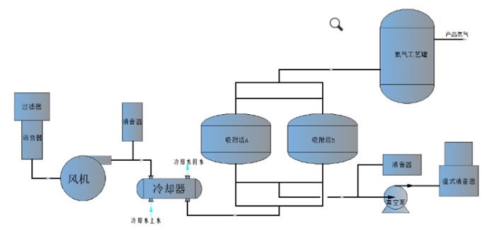 VPSA真空變壓吸附制氧工系統(tǒng)主要由鼓風(fēng)機(jī)、真空泵、切換閥、吸附塔和氧氣緩沖罐組成。原料空氣經(jīng)吸入口過濾器除掉灰塵顆粒后,被羅茨鼓風(fēng)機(jī)增壓后進(jìn)入其中一只吸附器內(nèi)。吸附器內(nèi)裝填吸附劑,其中水分、二氧化碳、及少量其它氣體組分在吸附器入口處被底部的活性氧化鋁所吸附,氮?dú)獗簧喜康姆惺肿雍Y所吸附。而氧氣(包括氬氣)為非吸附組分從吸附器頂部出口處作為產(chǎn)品氣排至氧氣緩沖罐。